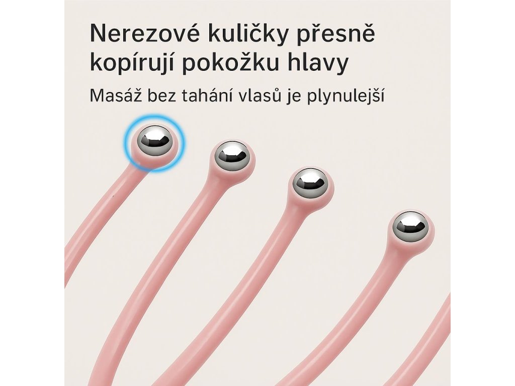 Masážní hřeben je navržen tak, aby se dokonale přizpůsobil tvaru hlavy. Každý z devíti pružných drápů vyvíjí optimální tlak pro hlubokou stimulaci pokožky. Tím pomáhá zlepšit mikrocirkulaci, uvolnit napětí a přispívá ke zdravější vlasové pokožce. Rukojeť je ergonomicky tvarovaná, což umožňuje pohodlné držení i delší masáž bez únavy.